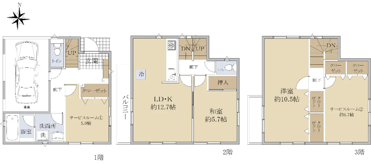 ■2SLDK(1階サービスルーム:約5.0帖 3階サービスルーム:約6.7帖)