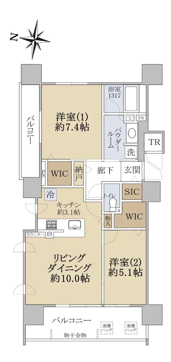 間取りは北西角住戸の2LDKで、全居室に収納がございます。