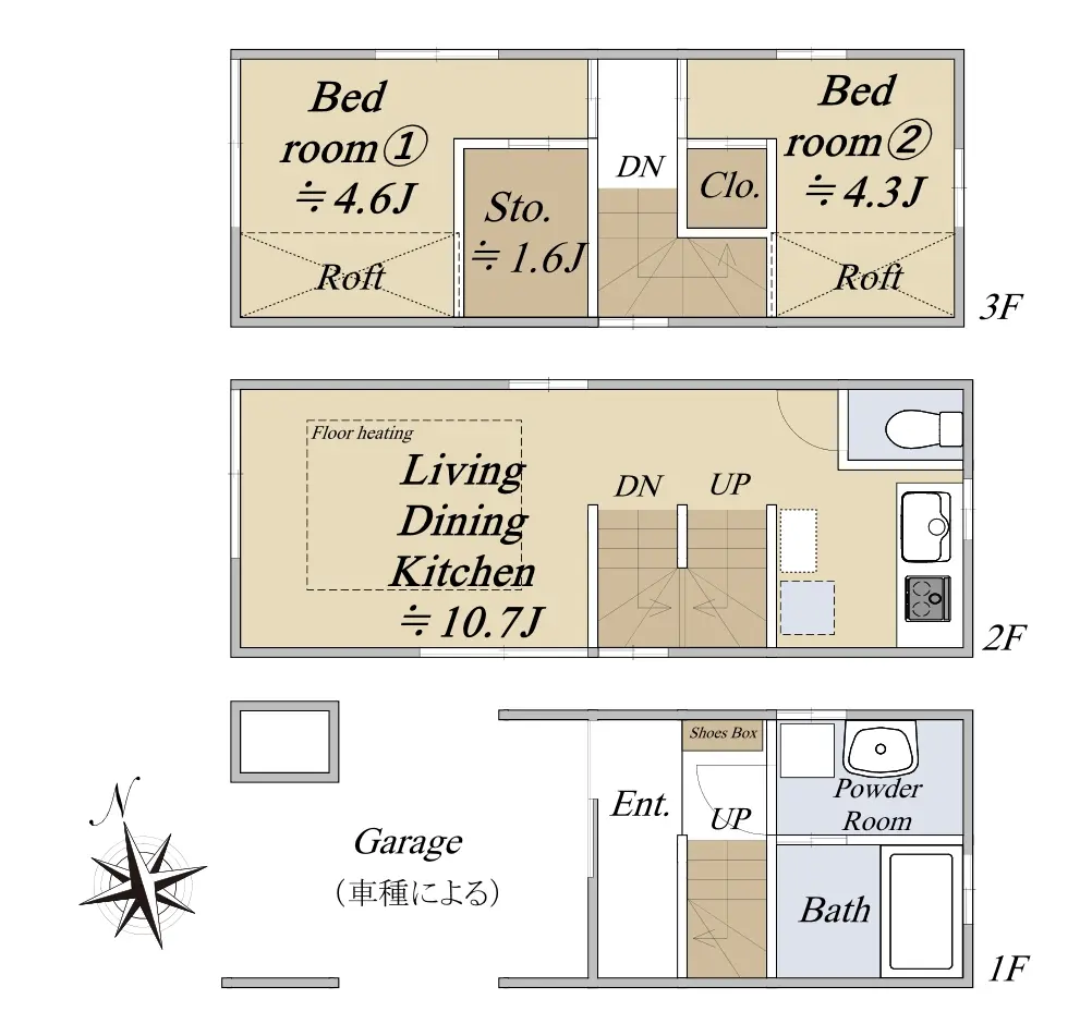 ・建物面積:55.19㎡(1階11.51㎡、2、3階各21.84㎡)