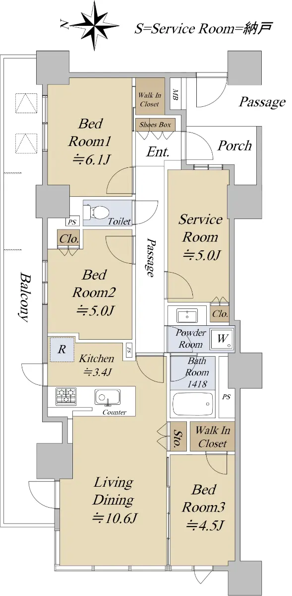 間取は3SLDK+WIC(WIC=ウォークインクローゼット)、洗面所にはリネン庫があり、