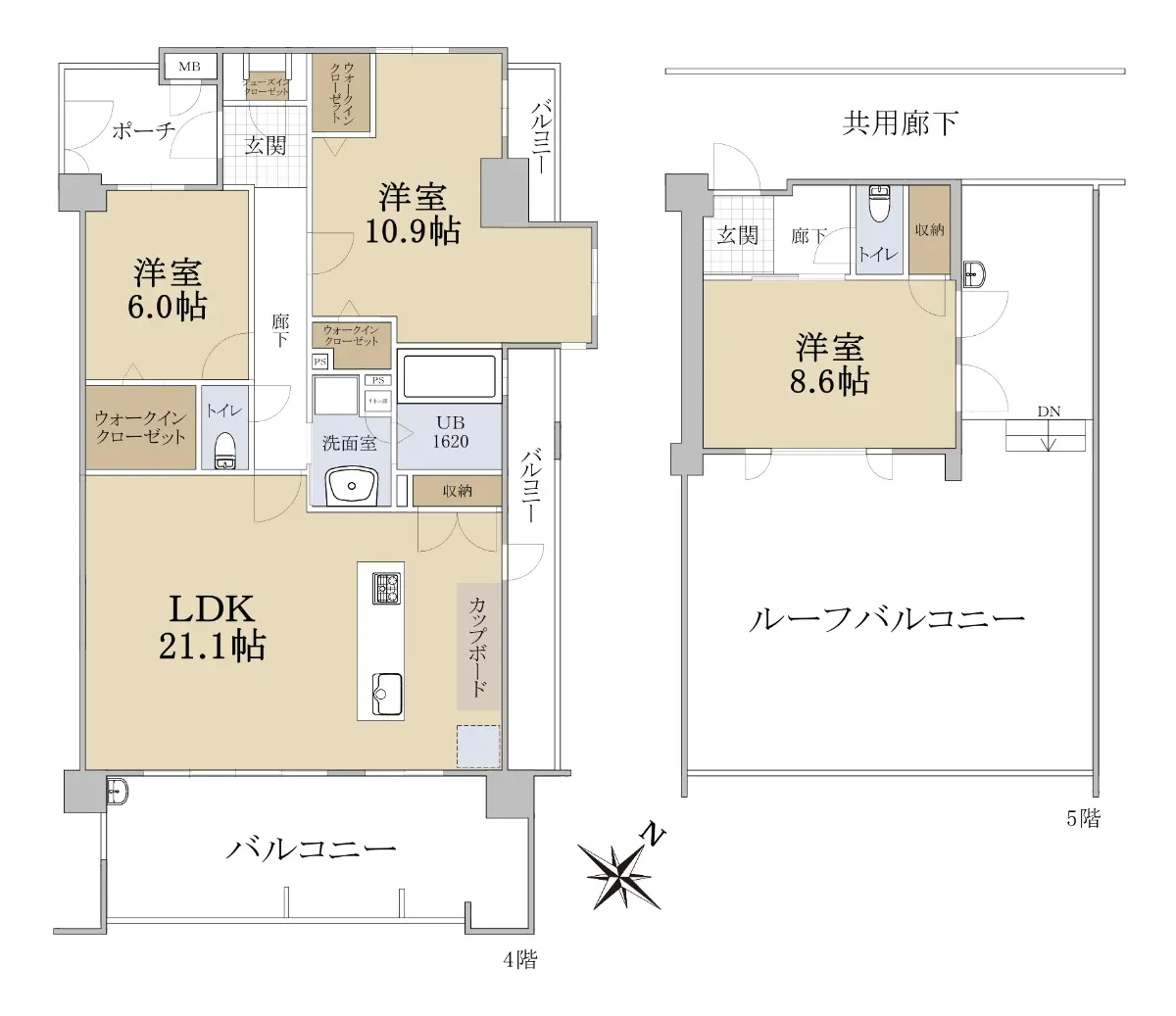 ・洋室は10.9帖・8.6帖・6.0帖で全室6帖超え