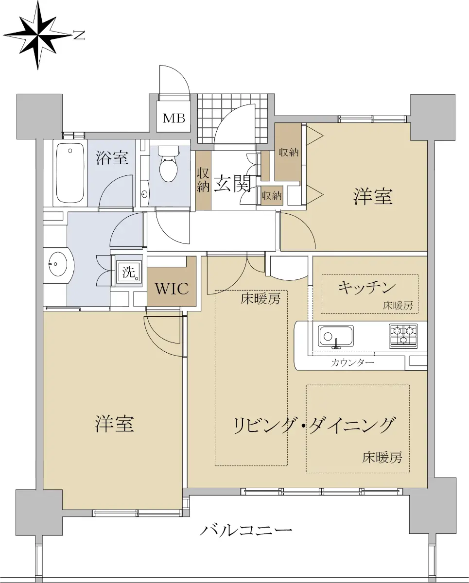 バルコニーに面した洋室にはウォークインクローゼットが、その他洋室や玄関にも収納が充実してございますので、お荷物の多いご家庭にも安心してお済いただけます。