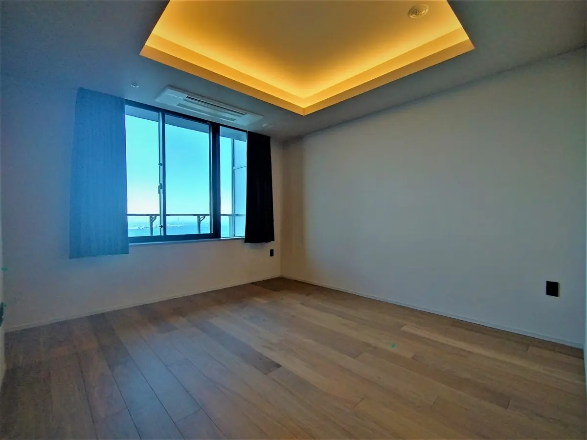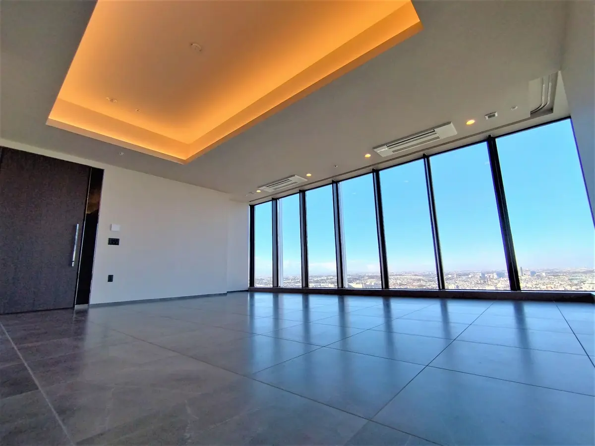 約23.1帖の広々としたLDは天井高が約3mあり(折上天井部分)、北側の一面全部が窓になっているため、開放感があり眺望良好でございます。