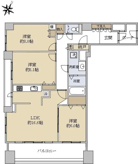 本物件は、5階部分角住戸、3LDKのお部屋です。