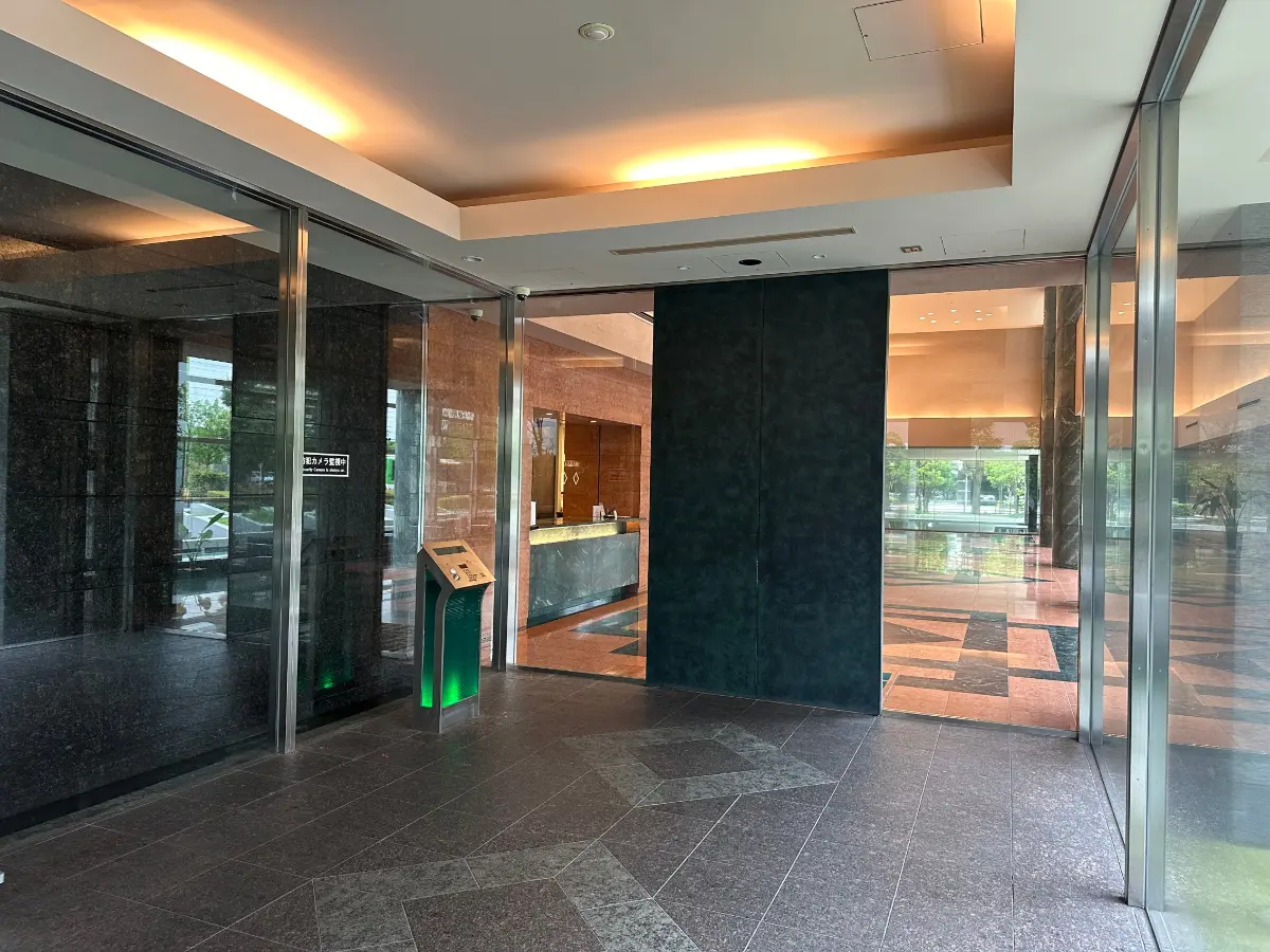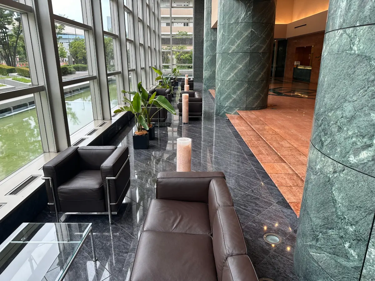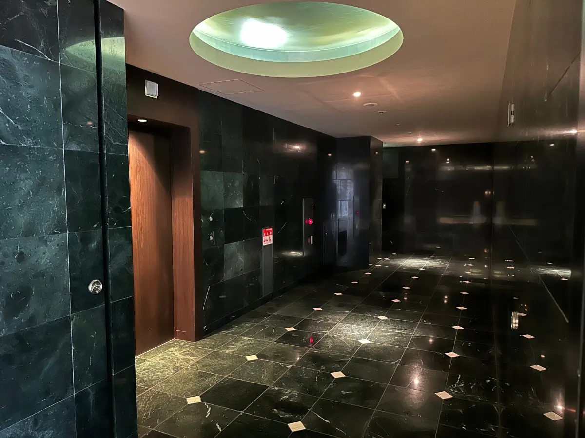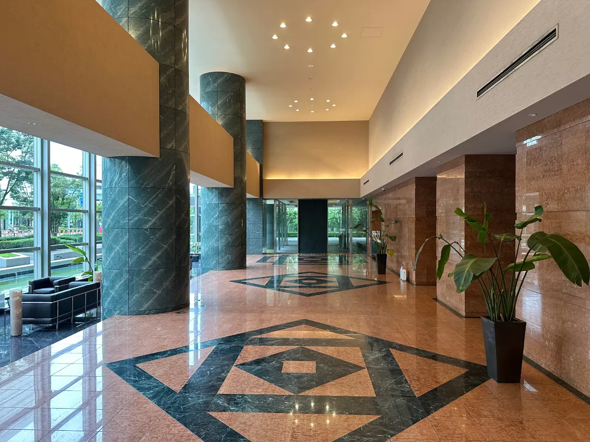 水景が広がるアプローチを抜けると、赤と緑の鏡面大理石で彩られたロビーが来訪者を迎え、