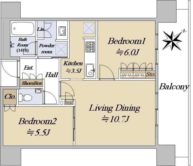 ・専有面積:58.06㎡、2LDK