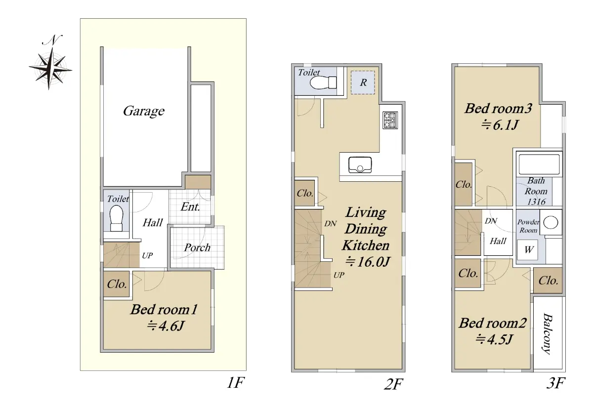 ・建物面積:74.60㎡(1階15.45㎡、2階30.61㎡、3階28.54㎡)