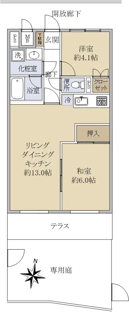 本物件は、専用庭、テラス付き、南東向きの住戸で、陽当たり、通風が良好です。
