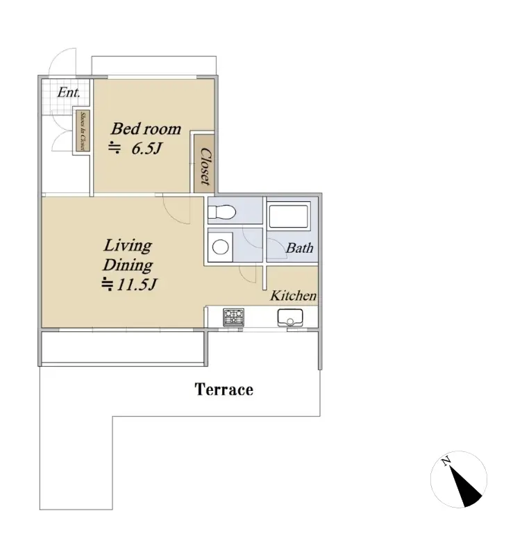 お部屋の間取りは、1LDKです。