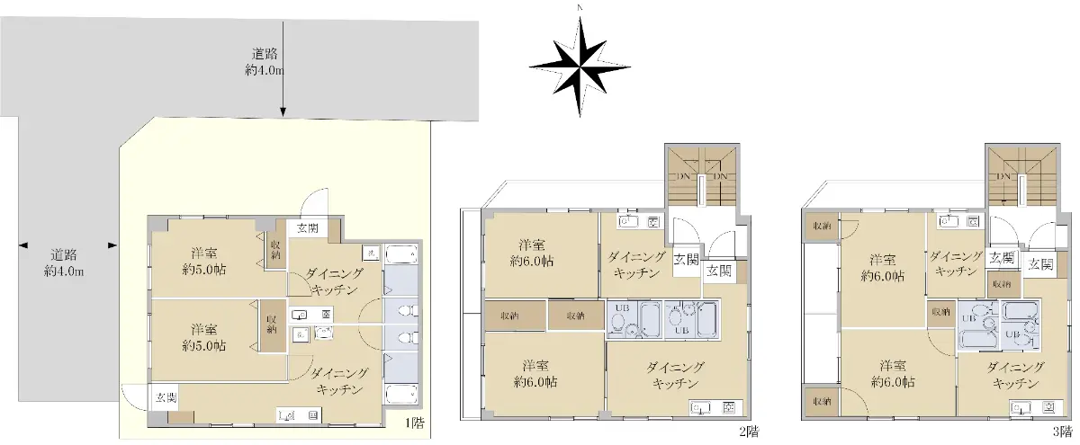 北・西の角地であり、北側公道約4.0m、西側私道約4.0mに接しております。
