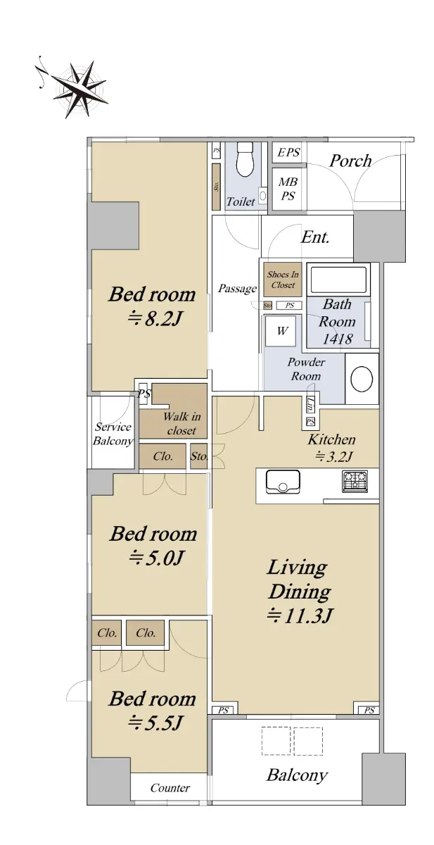 お部屋は玄関ポーチ付の3LD・Kで、独立性を高める玄関ポーチ付の角住戸で、共用廊下に面する居室のない間取りです。