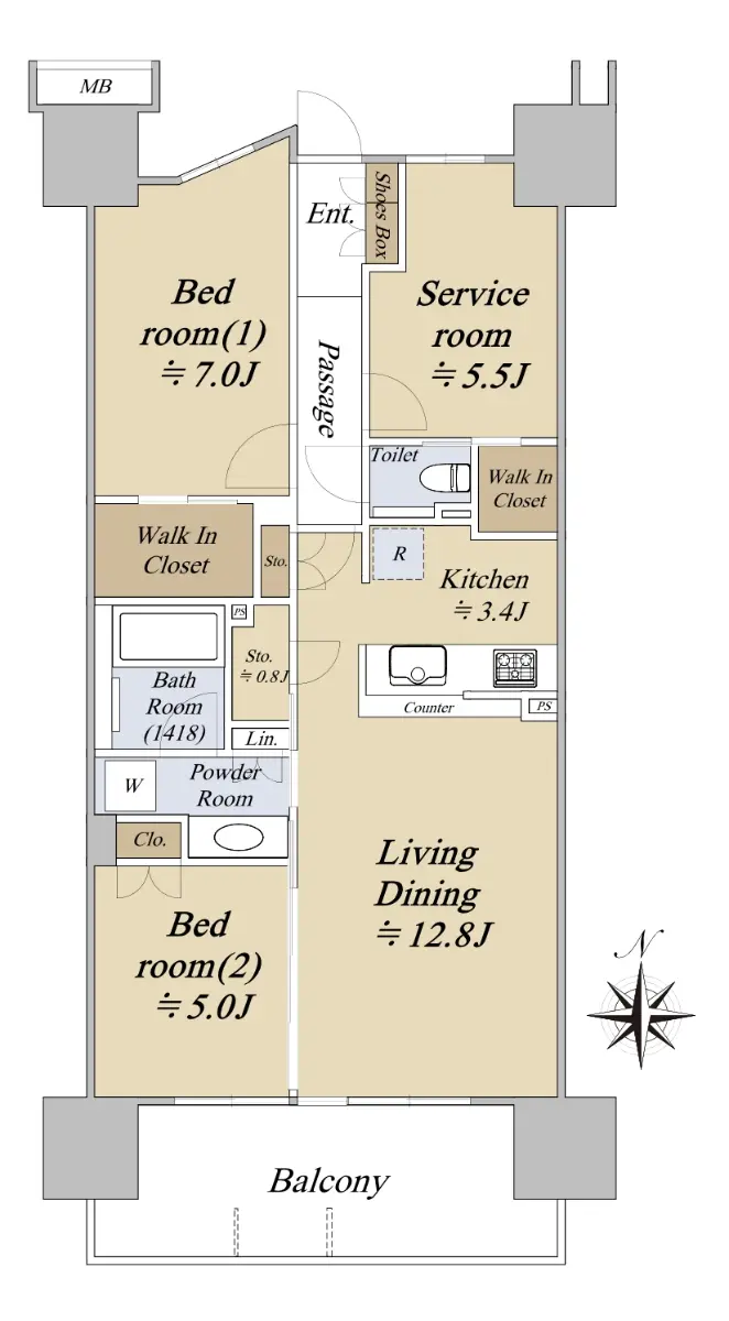 南向きバルコニー、75.24㎡の2SLDK住戸となっており、収納も豊富です。