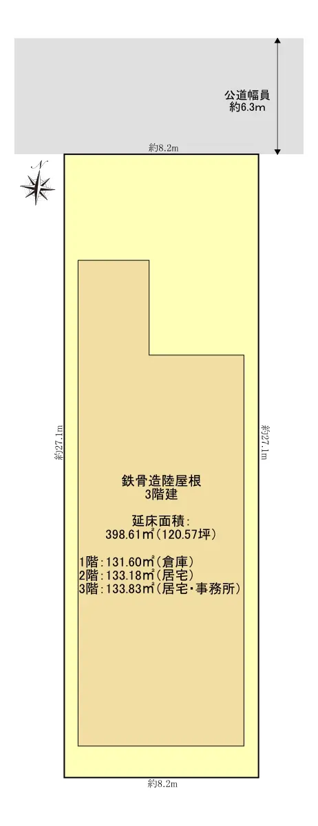 1階:131.60㎡(倉庫)2階:133.18㎡(住居)3階:133.83㎡(住居/事務所)