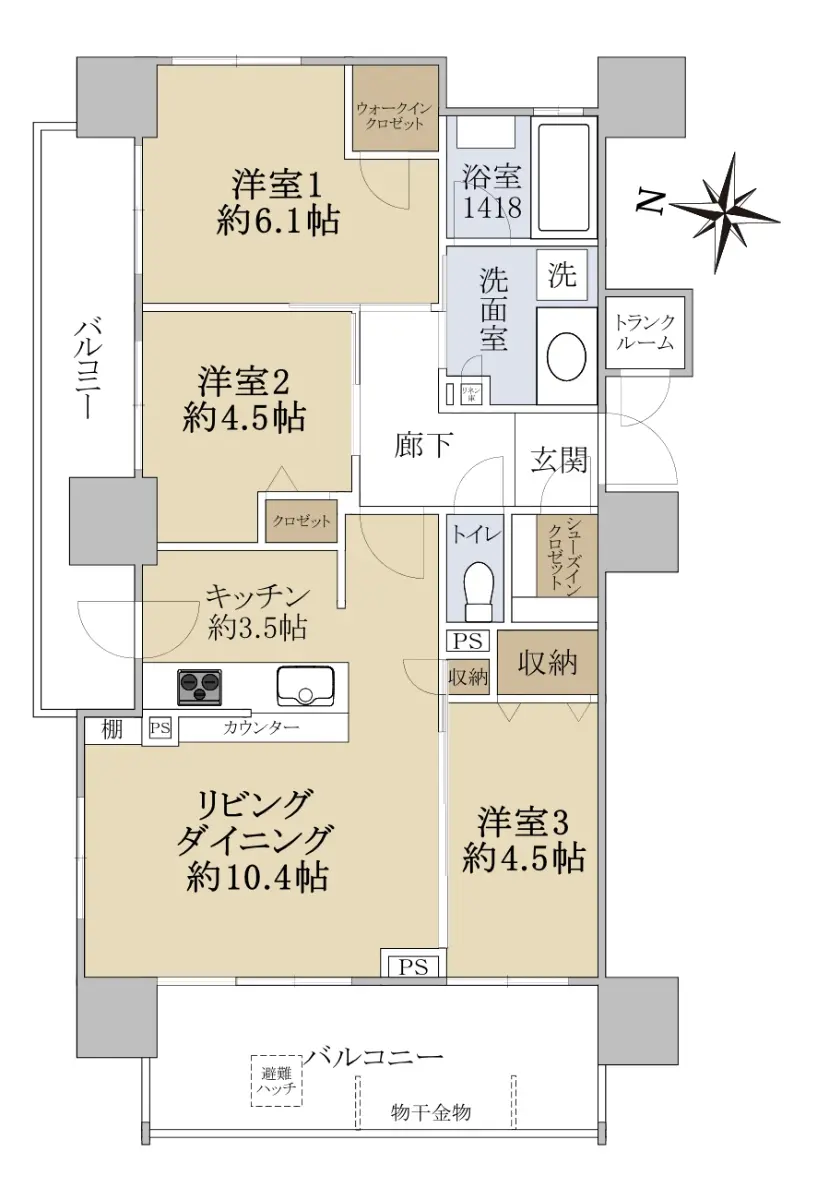 専有面積:68.28㎡の3LDK+WIC+SICの角住戸で、リビング及び洋室1にはエアコンの設置が可能です。