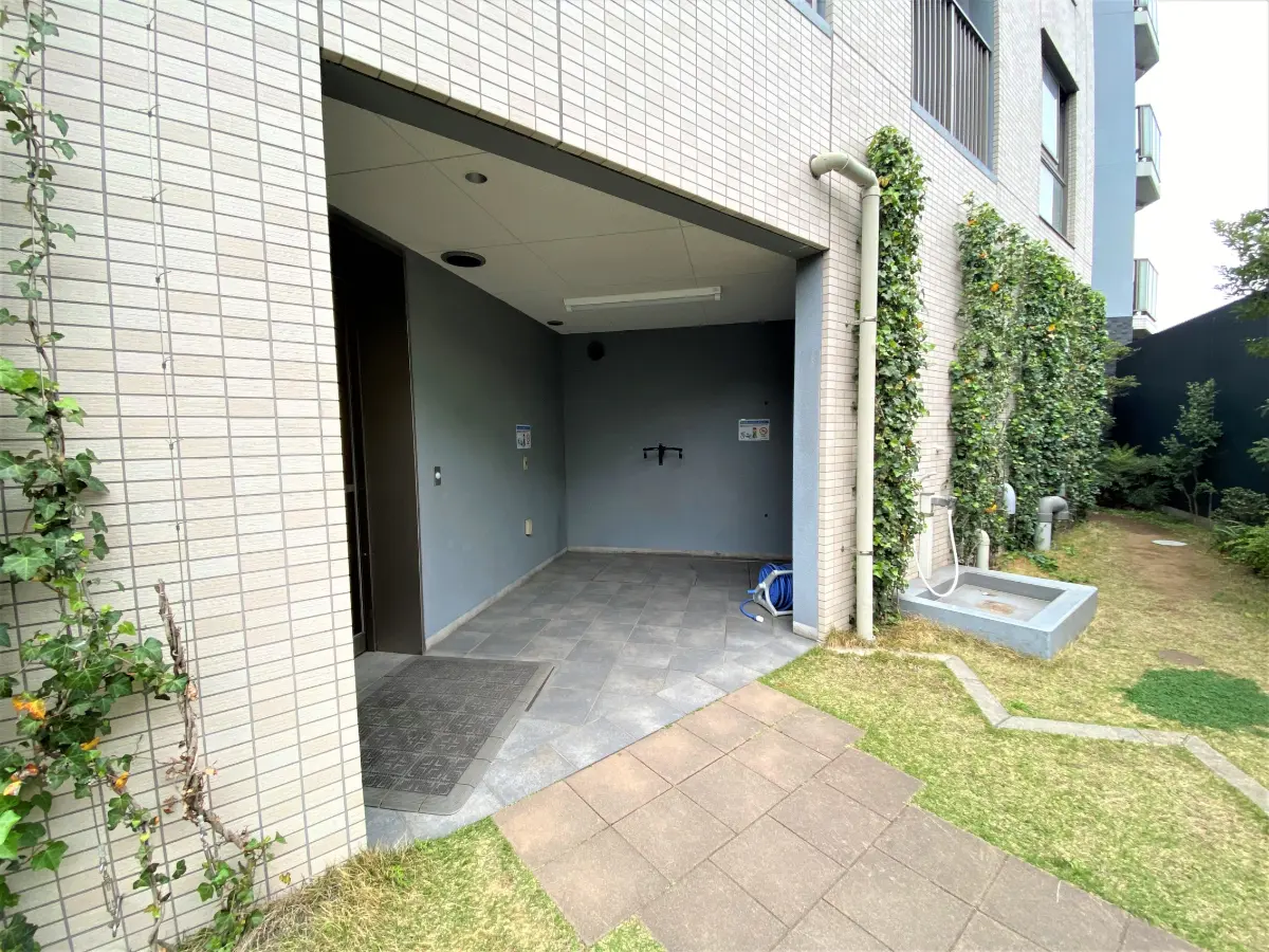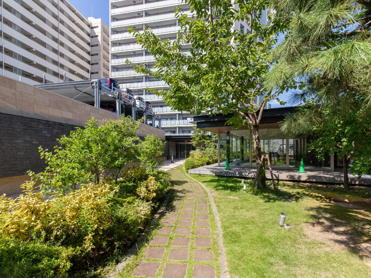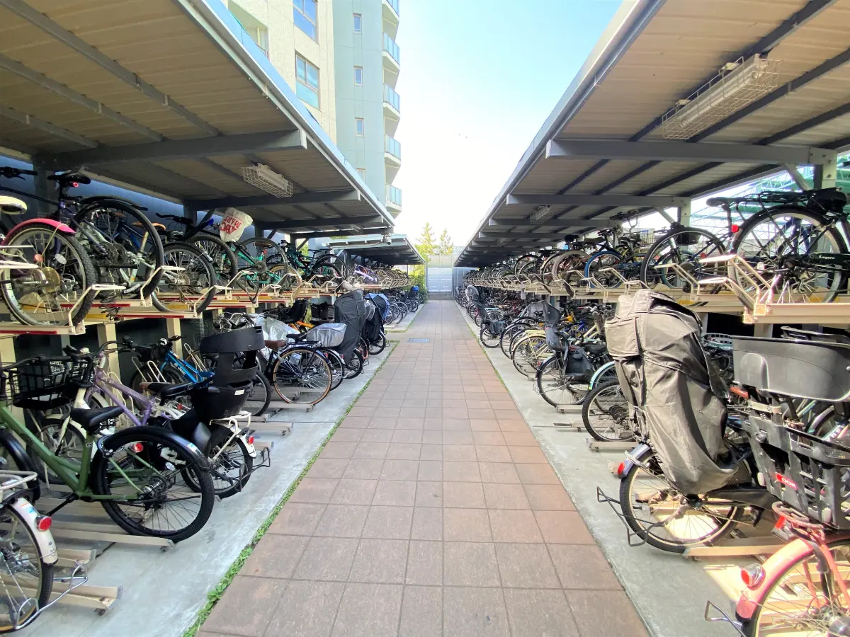 エントランスに至るまで約50mのアプローチが設けられており、コミュニティハウスや駐車場、自転車置き場やバイク置き場がアプローチの両サイドに設置されています。