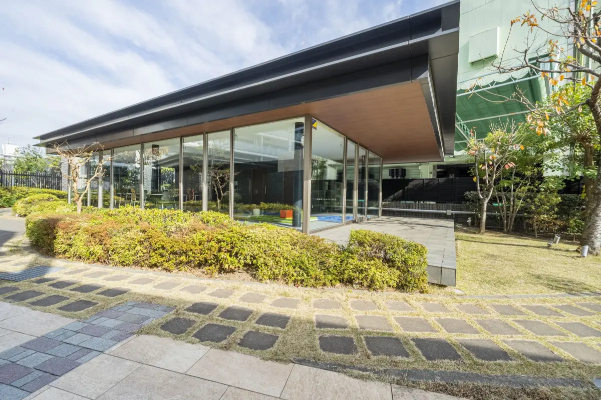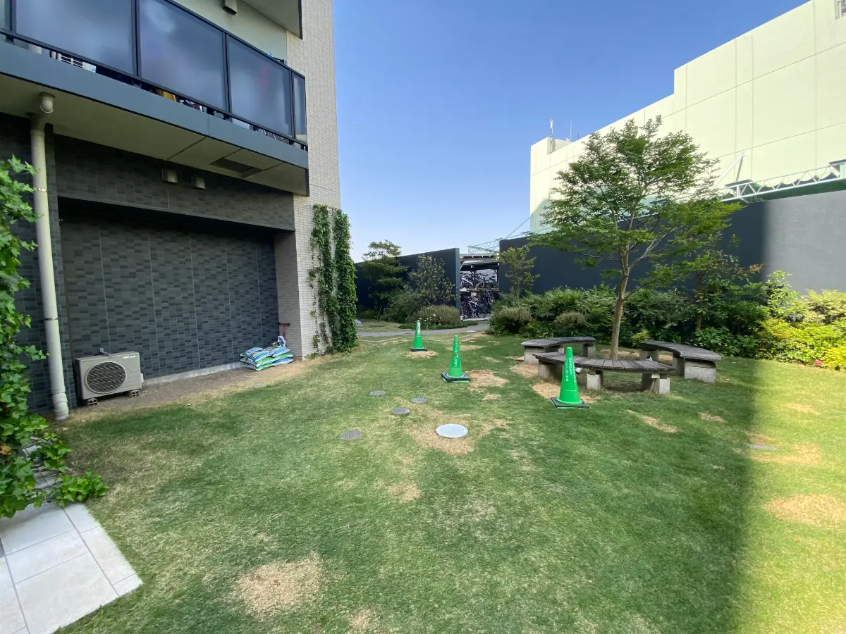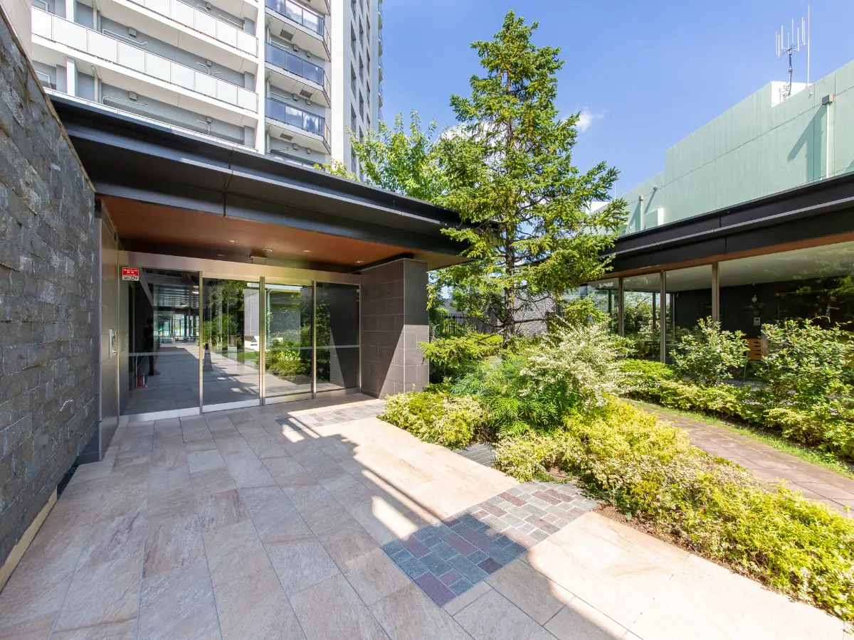 エントランスに至るまで約50mのアプローチが設けられており、コミュニティハウスや駐車場、自転車置き場やバイク置き場がアプローチの両サイドに設置されています。