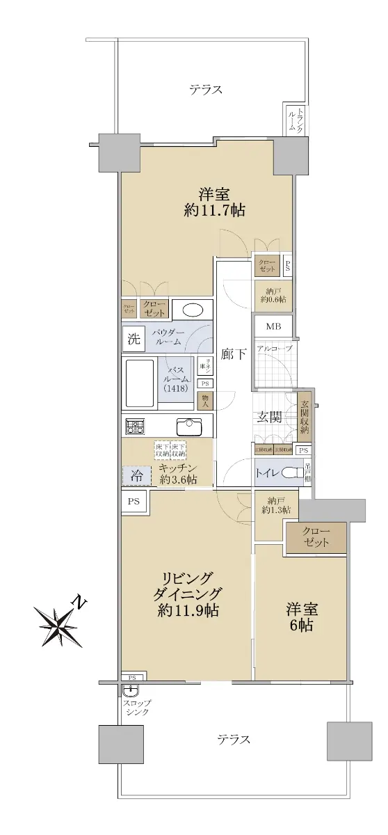 テラス面積が34.64㎡ありますので、ゆとりのある室内を是非ご覧ください。