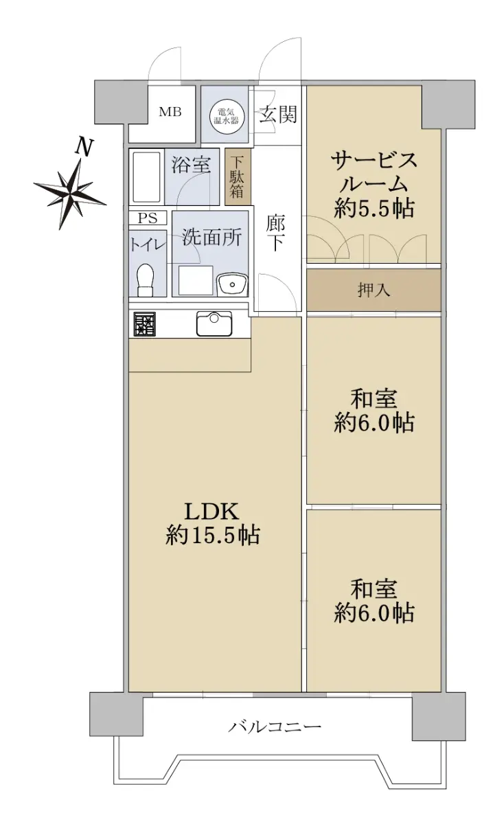 間取りは2SLDK、南向きリビング・バルコニーのお部屋です。