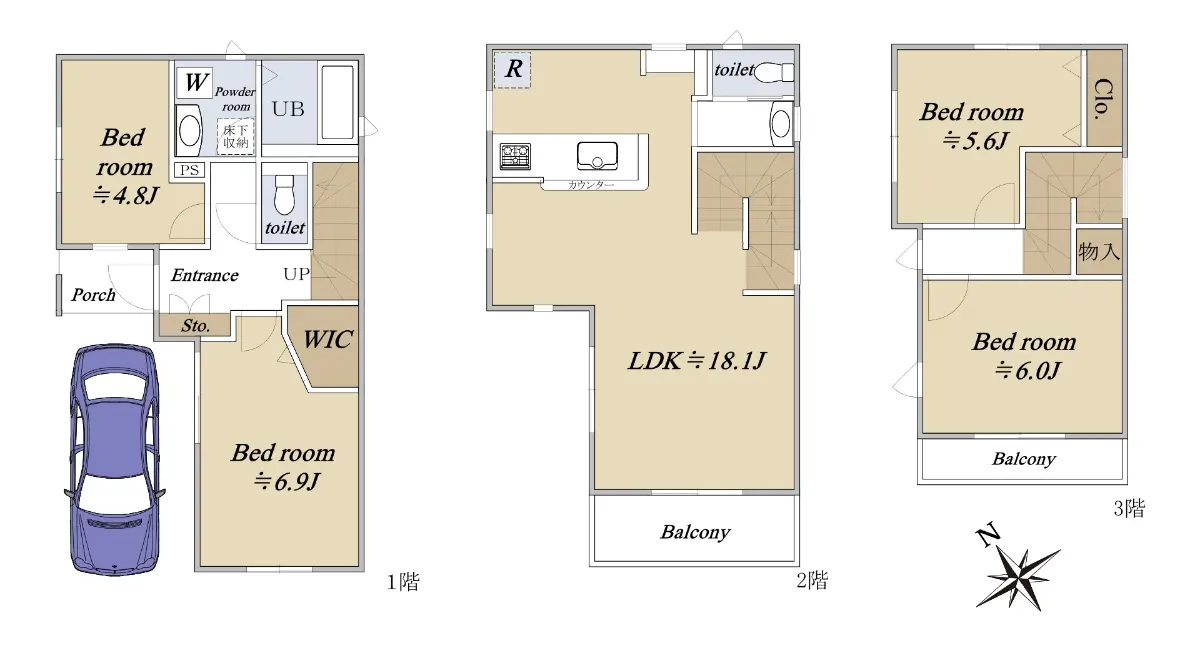 (1階:36.54㎡、2階:36.43㎡、3階:26.47㎡)