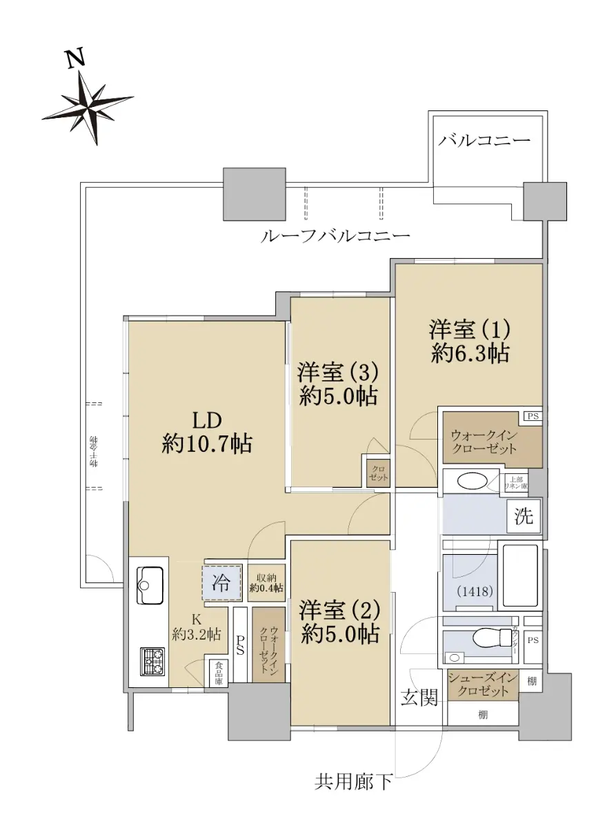 本物件は、バルコニーを北側に設けた通風、採光に優れた明るい角住戸となっており、23.52㎡のルーフバルコニーも魅力の一つです。洋室(約6.3帖、約5.0帖)には収納力のあるウォークインクローゼット、約0.4帖(LD)の収納もございます。洗面所にはリネン庫があり、お部屋全体の収納力が高い物件です。