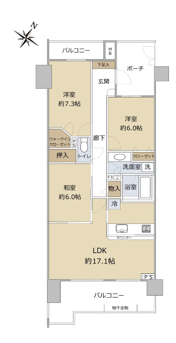 間取りは3LDKです。全居室に収納、廊下にも物入があり、季節物や趣味の物もすっきりと整理できます。