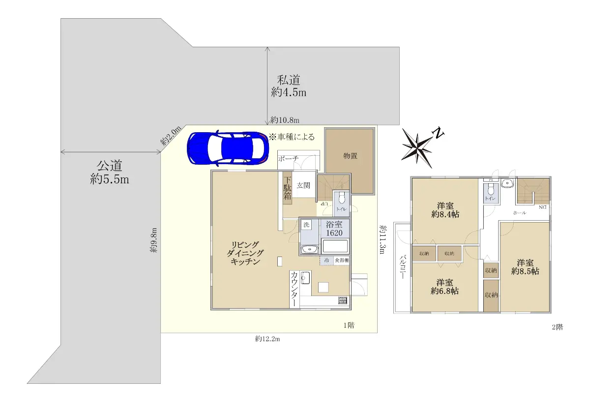 ・角地【南西側公道5.5m×北西側私道4.5m】○建物について
