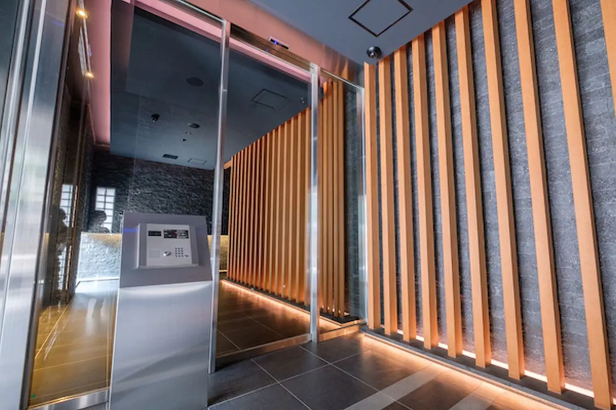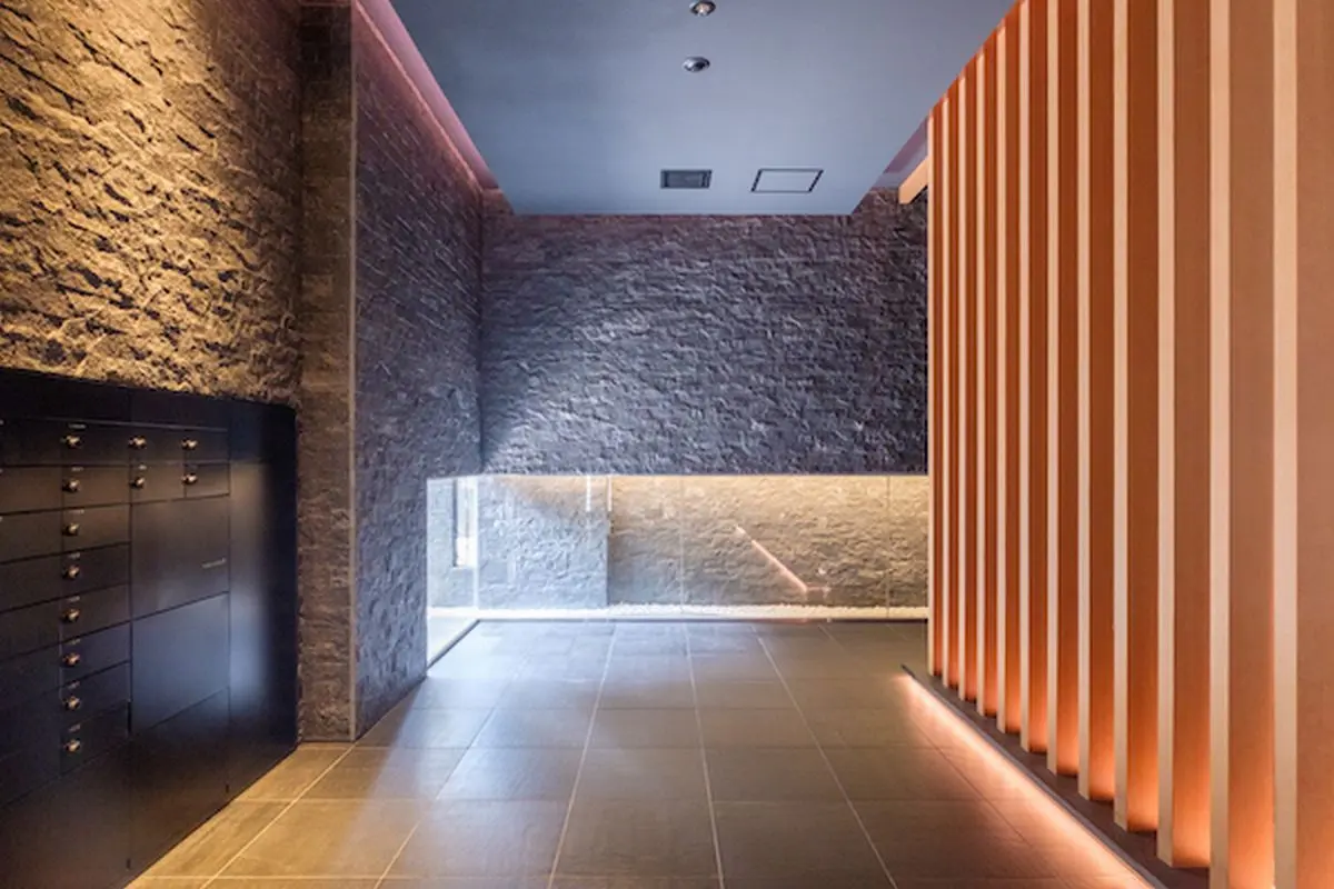 天然石を敷き詰められた間接照明がやさしい光のエントランスホールとラウンジは