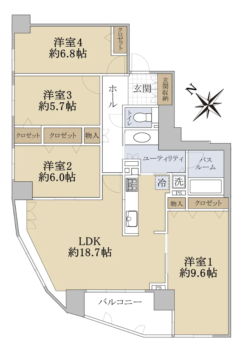 間取りは4LDKで、南西向きのバルコニーがあり、LDKは約18.7帖あります。