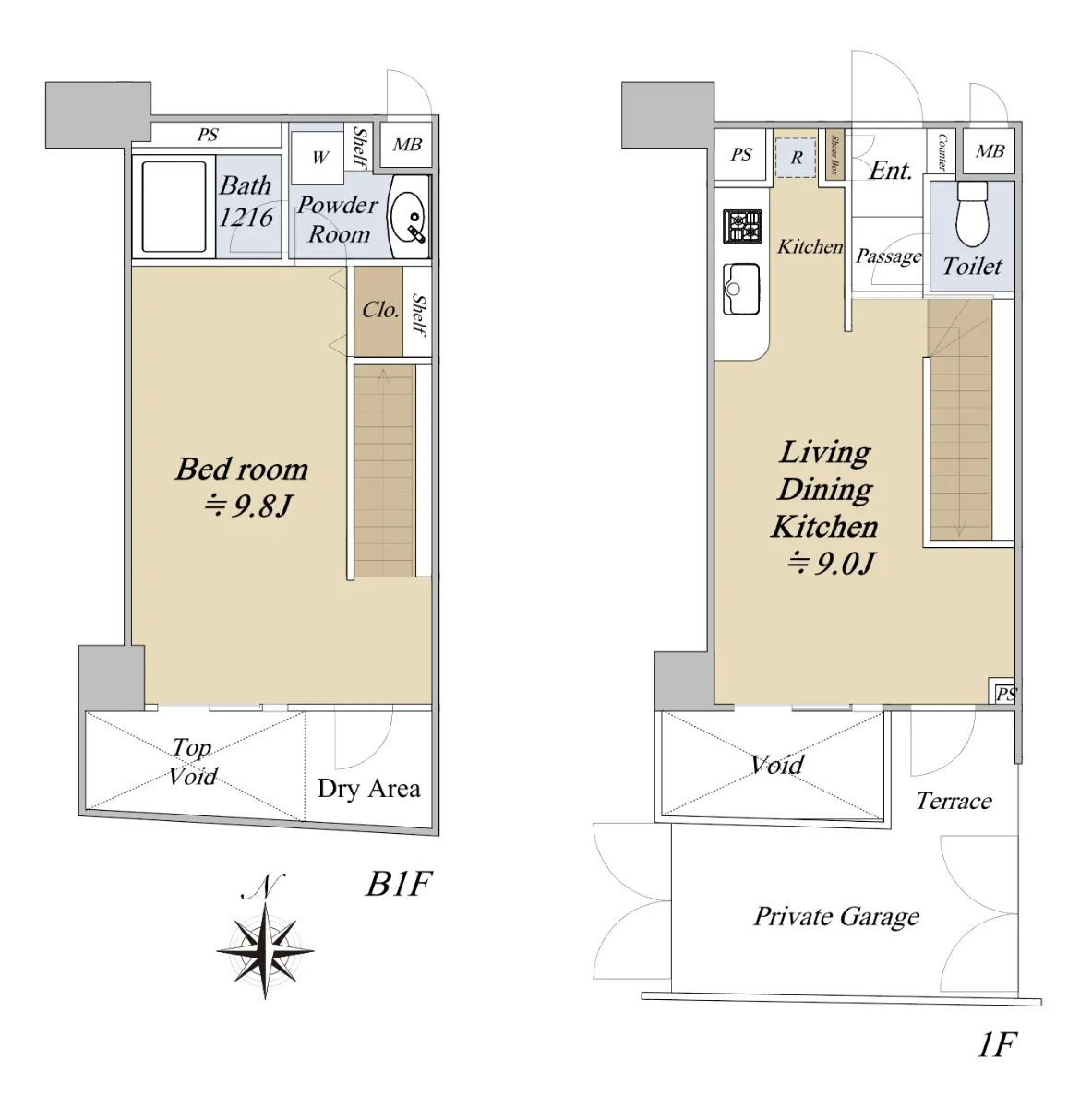 お部屋は【地下1階・1階部分メゾネット、1LDK 南向き】のタイプです。
