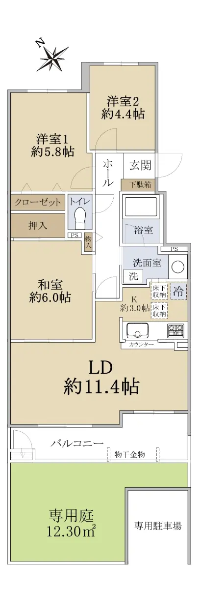 所在階は1階ですが、専用庭、専用駐車場付きの3LDKの物件でございます。