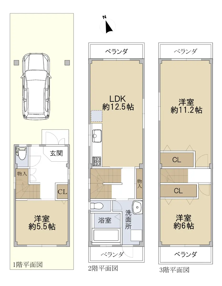 備註 本物件は、駐車場(車種による)付き3階建住宅です。