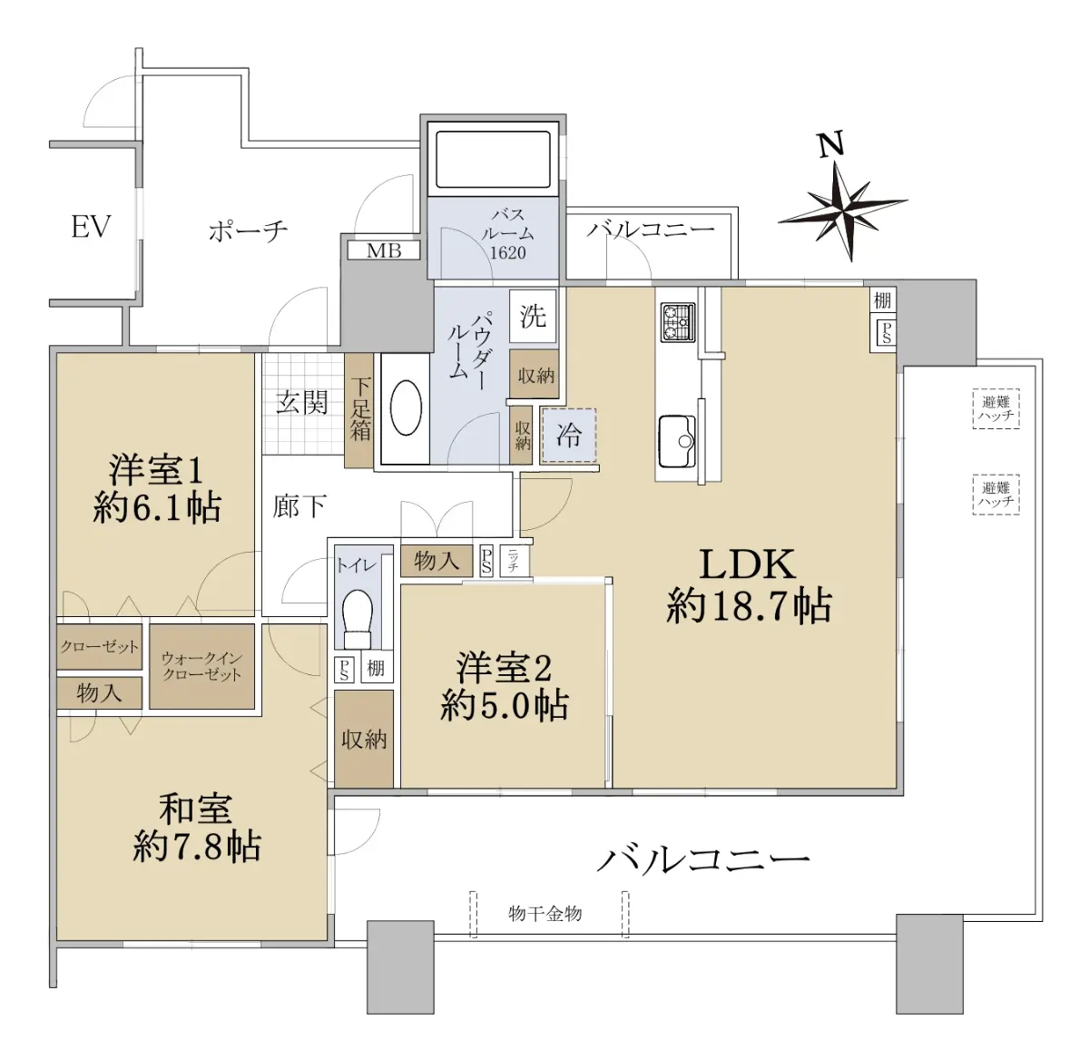 洋室6.1帖にはウォークインクローゼットを備え、各居室にも収納を確保したファミリー向けの間取りとなっています。