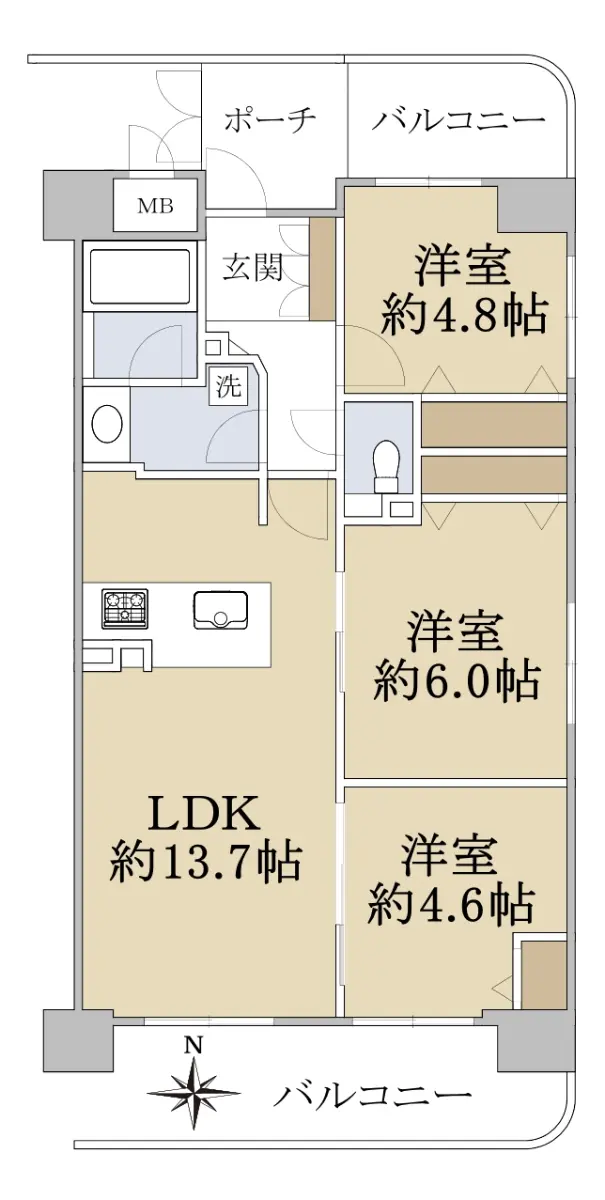 ■3方向角部屋(南・北・東)