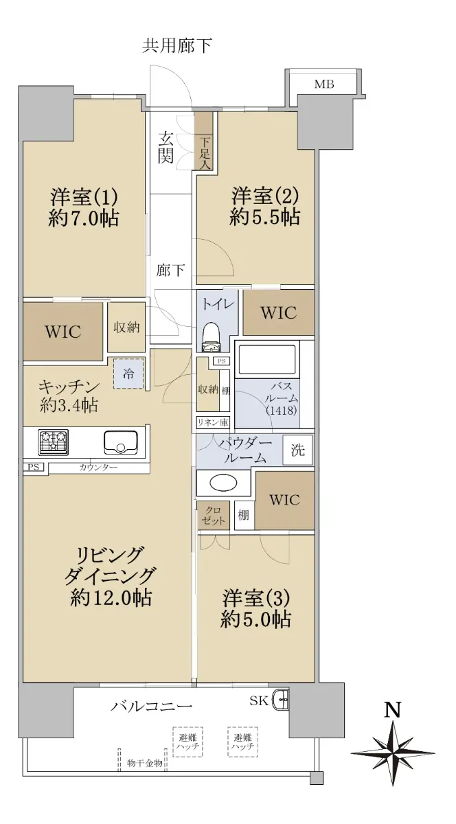 お部屋の間取は3LDK+3WIC(WIC=ウォークインクローゼット)です。