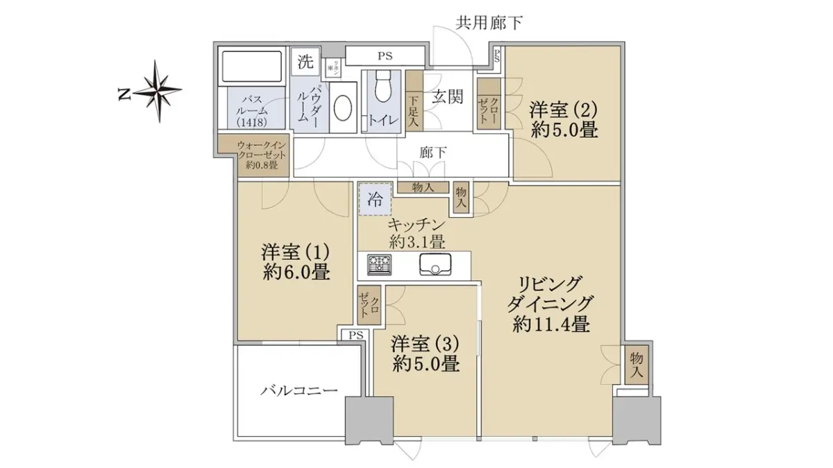 専有部分は70.56㎡の3LDK、WICや物入が3箇所など収納豊富なお部屋です。