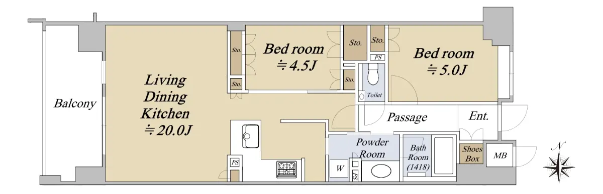 専有面積68.58㎡の間取り2LDKですので、