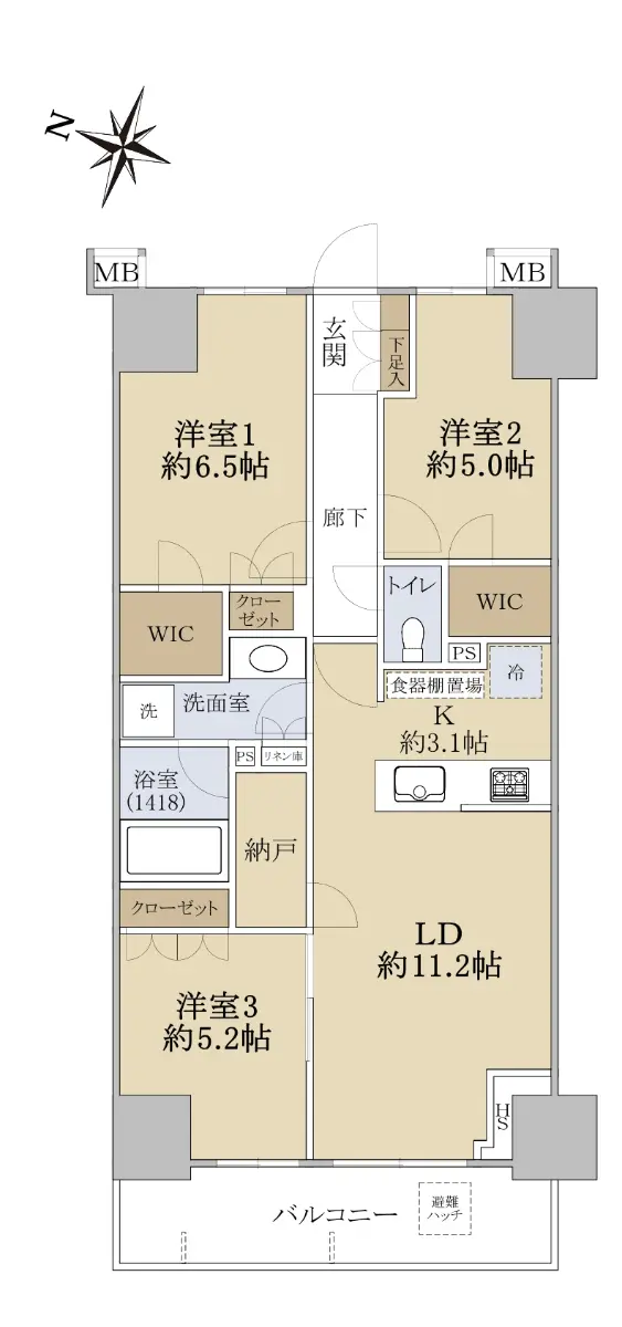 お部屋は専有面積:70.95㎡/3LDKです。