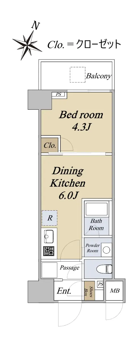 お部屋の間取りは、1DKです。