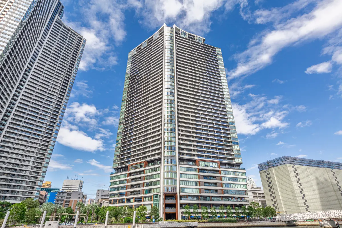 水辺に囲まれリゾートのような外構空間は、勝どきエリアのランドマークとして佇みます。