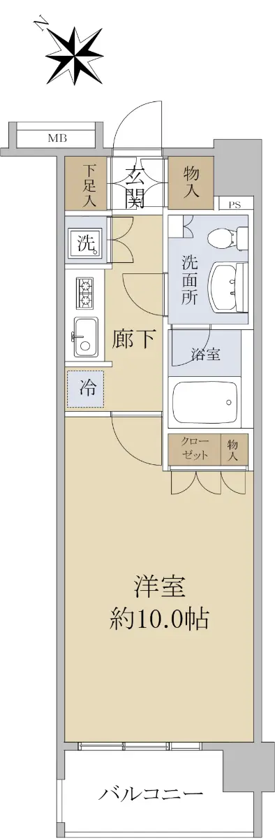 賃貸の需要が高いエリアとなっており、南西向き1Kの間取りとなります。