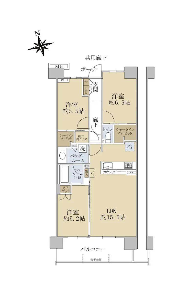 また3室の洋室の内、北側2室にはウォークインクローゼットが、南側の洋室にはクローゼットが備わっています。廊下部分にも約0.5帖の納戸を採用し、ご家財の多いご家庭にもご安心いただける造りでございます。