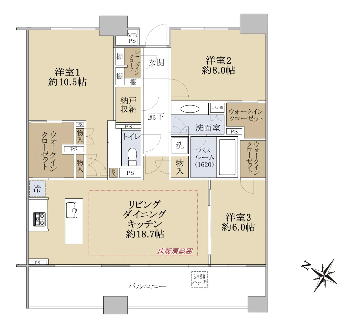 お部屋の専有面積100㎡超の3LDKで、充実した収納スペースが魅力の間取りです。