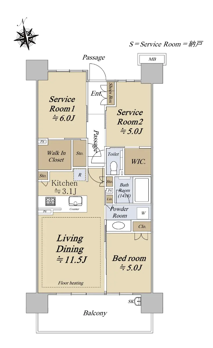お部屋については、70.42㎡の1LDK+2S(S=サービスルーム)タイプであり、