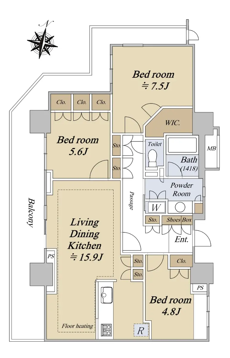 LDK約15.9帖、主寝室約7.9帖とゆとりがあり、1418サイズの浴室など、サニタリーも充実しています。