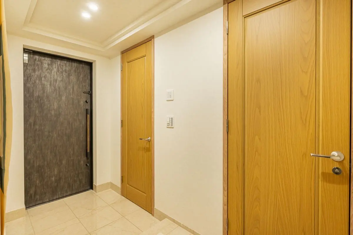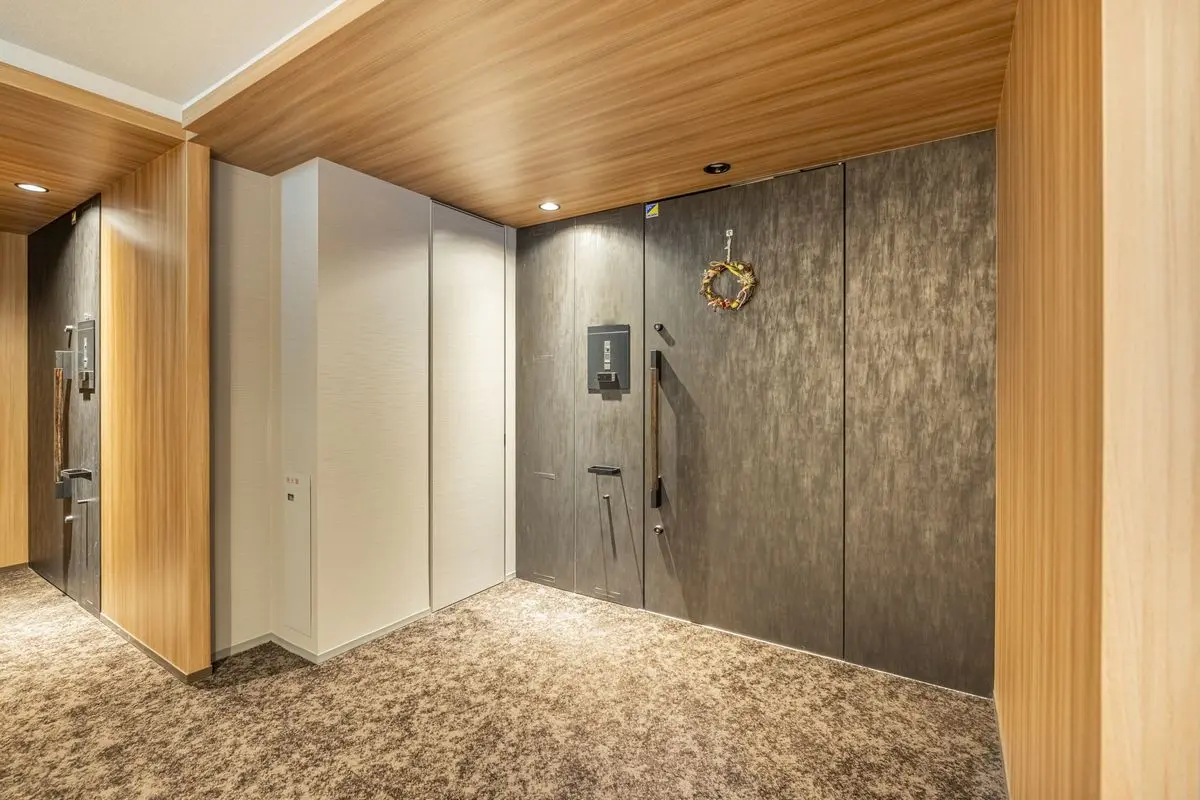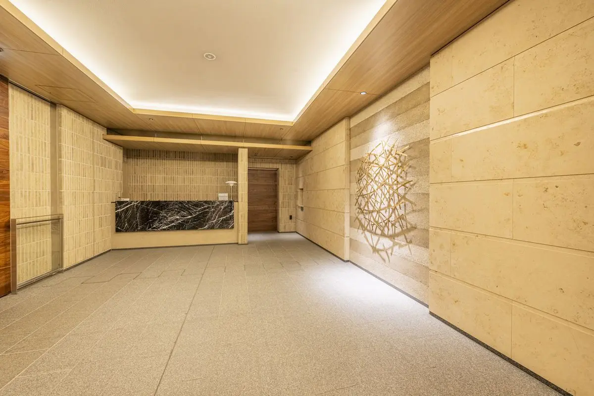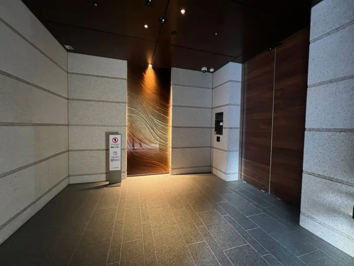 建物は角地に存在しており、外部からの視線を遮るクランク設計のエントランスとエレベーターホールです。