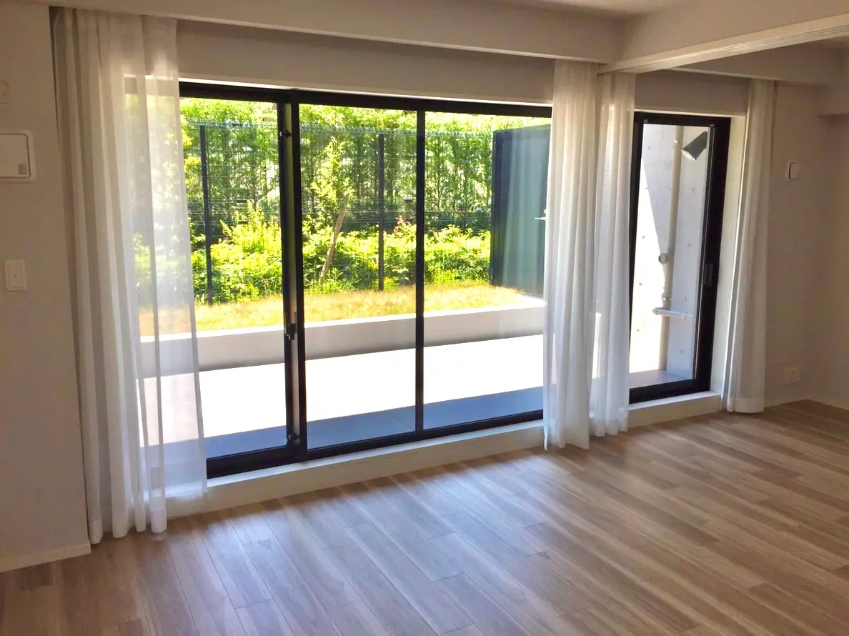 南東角部屋にて開口部が広く、南側は専有庭+テラスがあるため陽当たり、風通しが良好です。