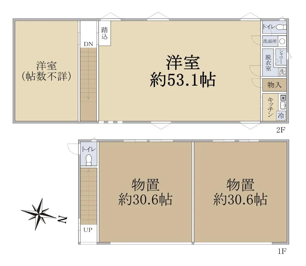 1階部分に倉庫2か所、2階部分に洋室2室が配された動線の良い間取りです。