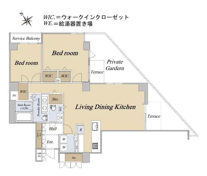 お部屋は、専用庭と2つのテラスが付いた2LDKの角部屋です。