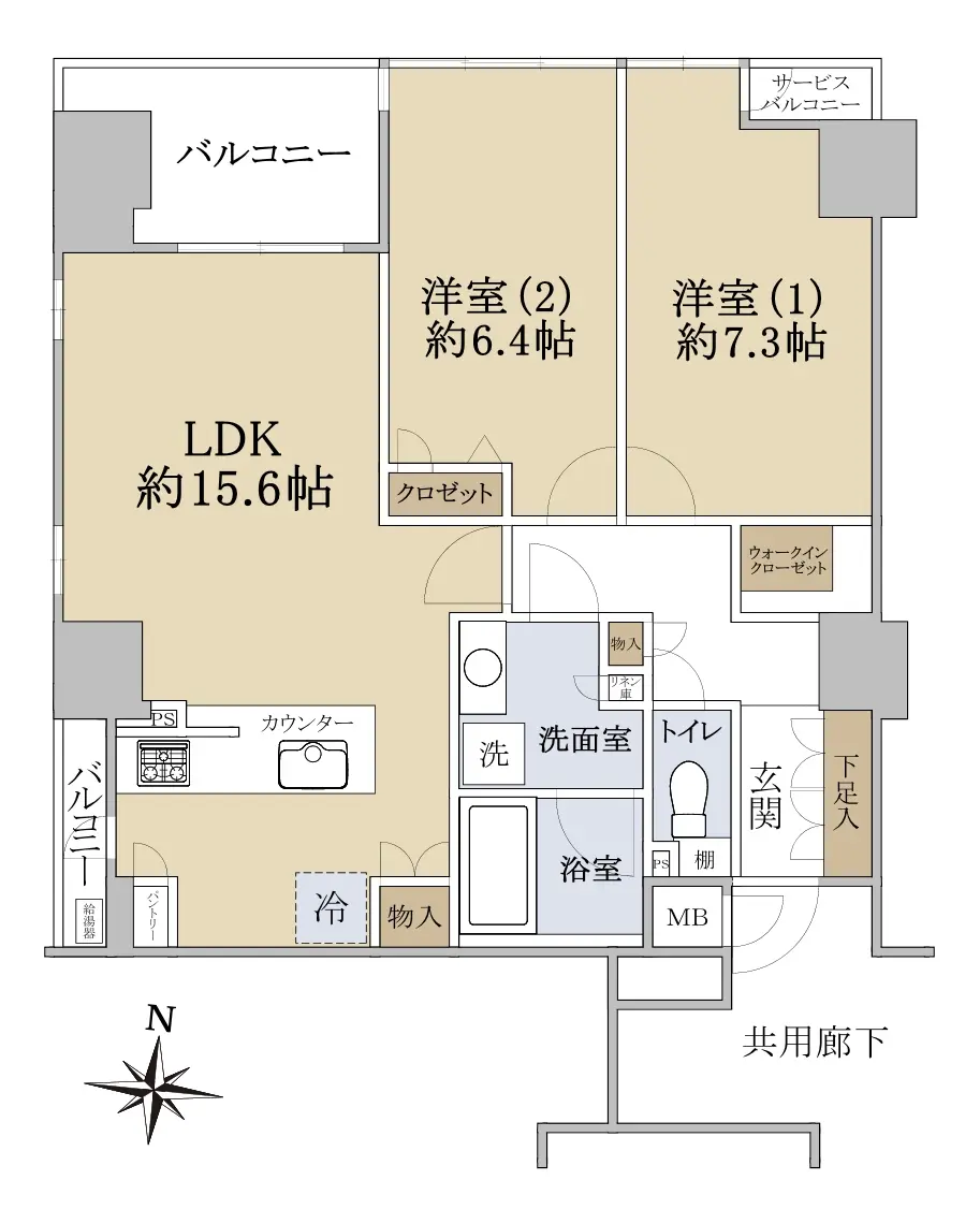 専有面積66.85㎡の2LDKで、LDKは約15.6帖です。
