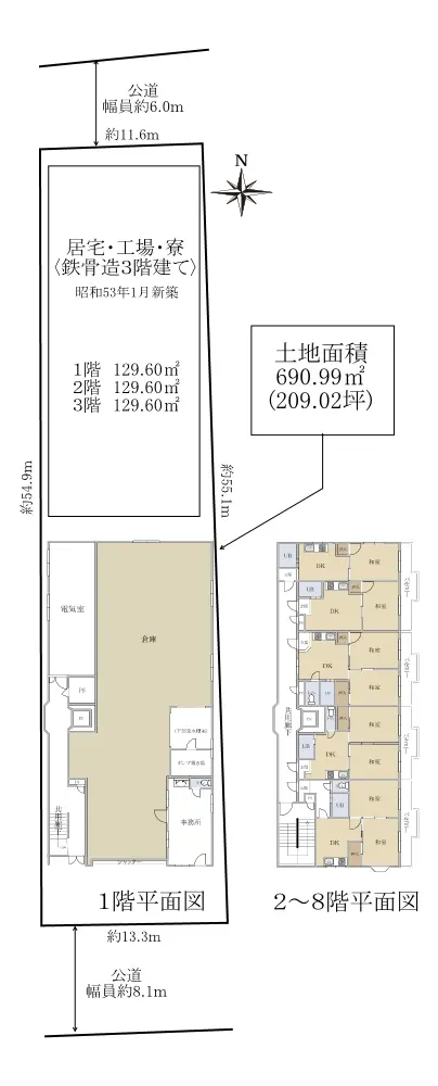 構造:鉄骨造陸屋根3階建 1階129.60㎡ 2階129.60㎡ 3階129.60㎡